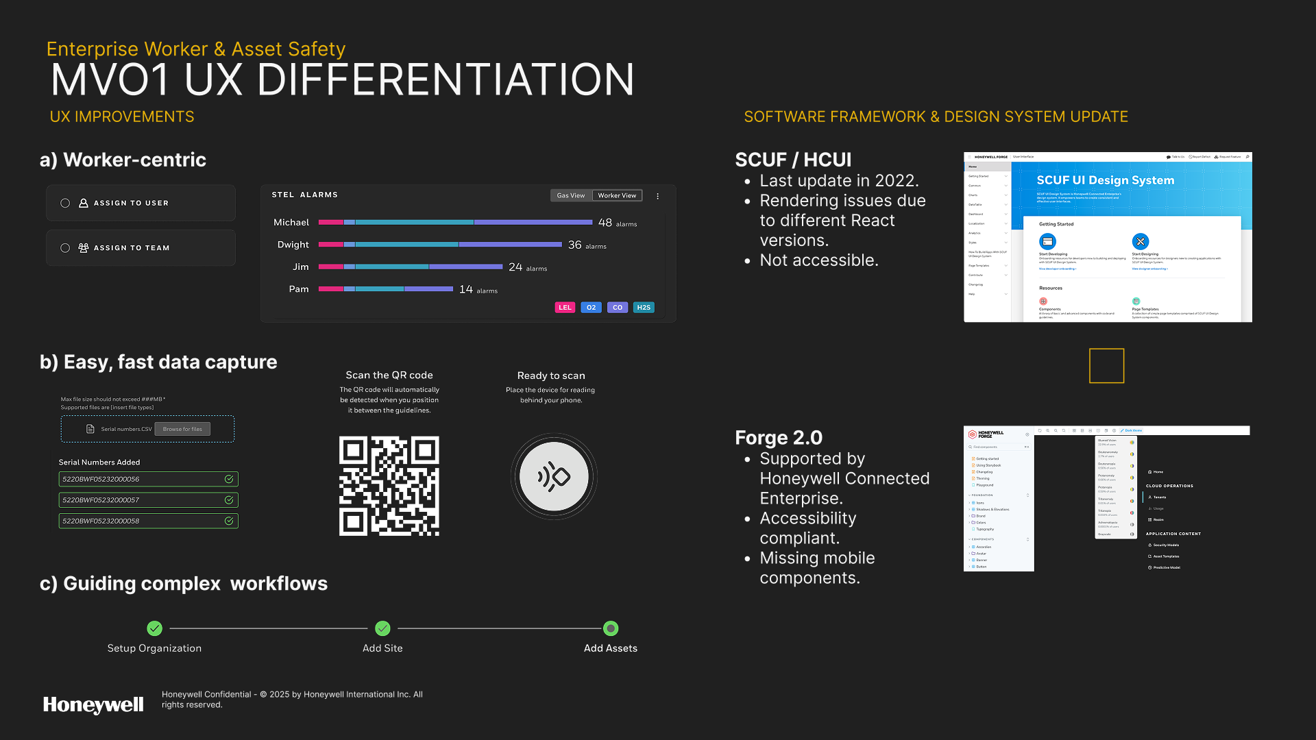 The Safety Suite redesign shifts to design principles surrounding a worker-centric model as the system makes safety more human and personal. Operators can instantly see who is at risk which allows for faster, more targeted interventions. By focusing fast setup and data capture the new strategy directly addresses the project's goal of decreasing customer reliance on tech support. By using QR and NFC technologies we were able to reduce time and errors associated with manually entering serial numbers for hundreds of devices. By guiding workflows with step-by-step visual trackers the barrier to start using the software is lowered which reduces the need for extensive training. Leveraging the latest design system, Honeywell's Forge Design System, the EWS software is more accessible to all users as the result of high color contrast and screenreader-friendly design.