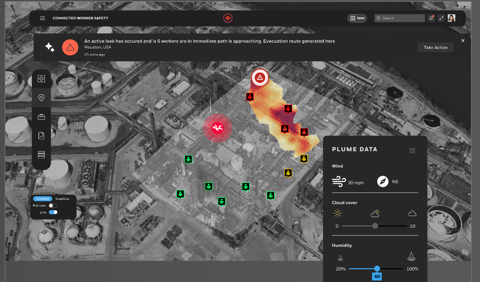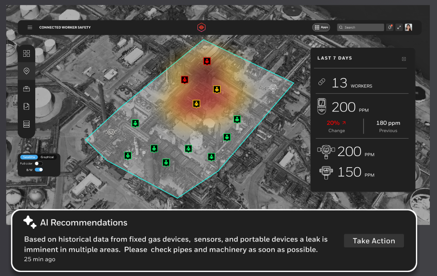 Instead of simple data points, this concept employs a color-coded "plume" or heatmap (red, yellow gradients) onto a satellite map. The AI model's prediction of hazardous situations are established by calculating gas dispersion based on data logs and external environmental factors (like wind direction). Our philosophy is that AI should be about "augmentation," not just automation. Human operators have a transparent view of complex data, empowering smarter safety decisions. A snapshot of instrumentation metrics from the last 7 days and a recommendation gives operators actionable data and steps to take to save lives in high stress environments.