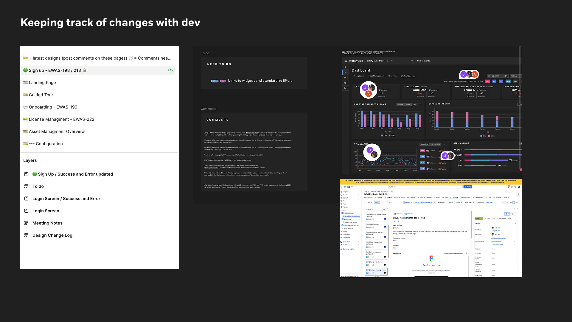 Pages are designated with indicators of production readiness and design screens map 1-1 with development Jira stories and issues (e.g., "Sign up - EWAS-198 / 213"). This ensures developers know exactly which design belongs to which ticket.
