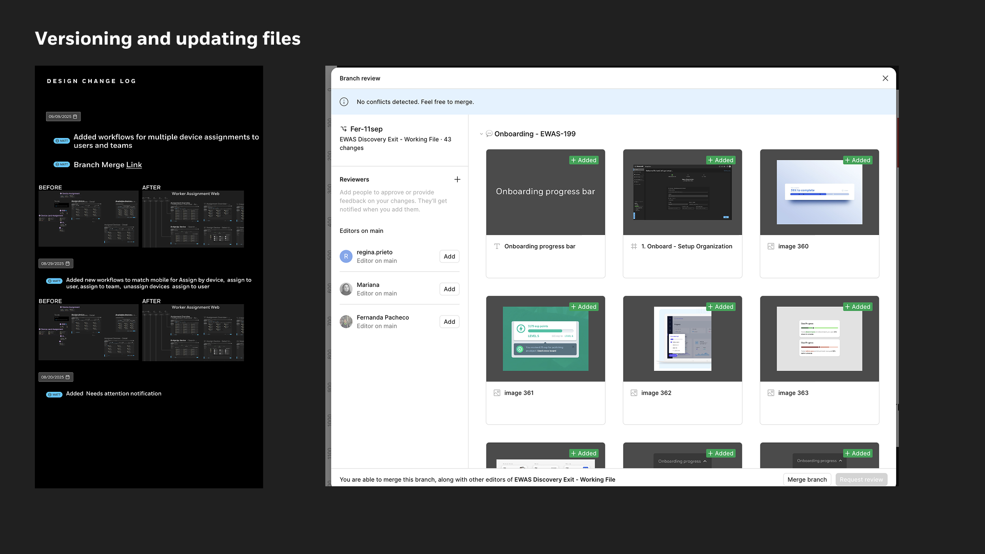 Branching and merging of design files helped to keep the design team and developer on the same wavelength. More senior designers can approve or reject changes, formalizing the design process and reducing overwrite need. Design iterations are meticulously tracked preventing version control issues with developers following the wrong design iteration which is common in large projects.