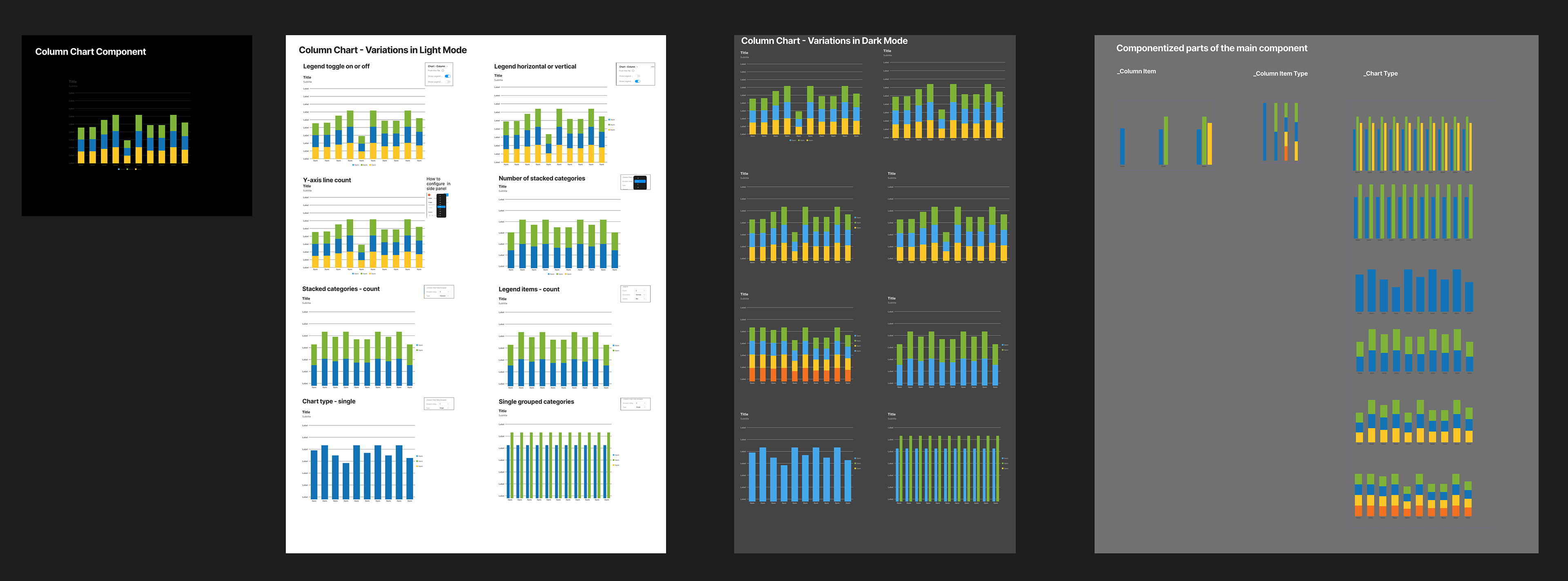 I led creation of a new Figma-based Honeywell legacy design system featuring over 500 component variations with responsive patterns, light and dark modes, and documentation across desktop, tablet, and mobile breakpoints. The “column chart” component shown here illustrates the methodology used to build this adaptable system.