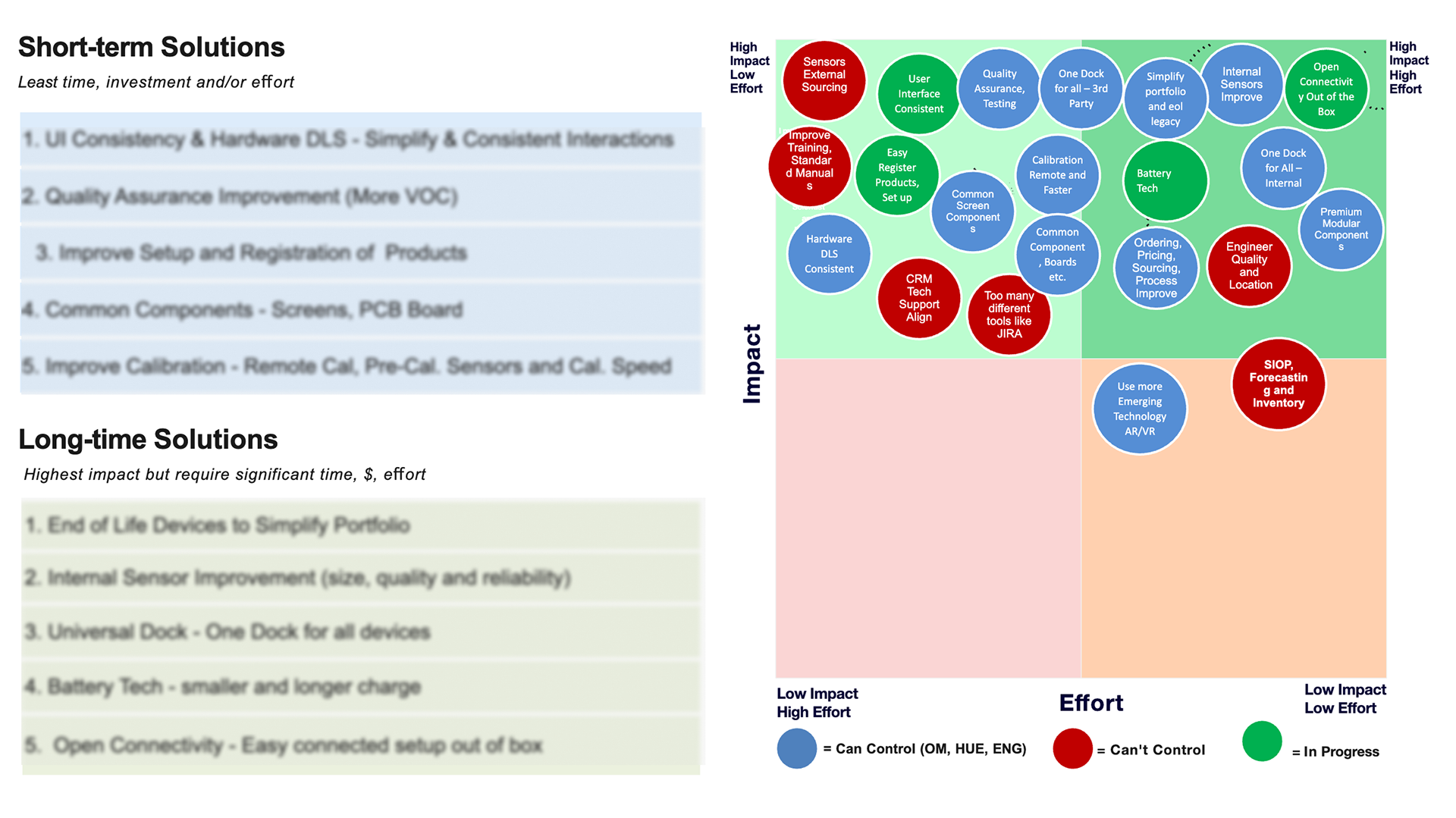 By identifying which solutions and features were high impact/high effort, high impact/low effort, low impact/low effort or low impact/high effort, the product team and I were able to confidently move forward with the knowledge that time was spent efficiently.