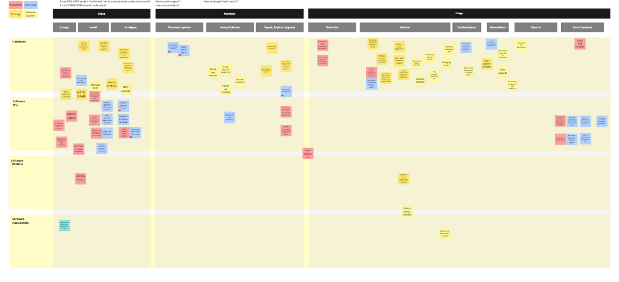 By conducting structured, conversational interviews with subject-matter experts, end users, and customers, I'm able to understand workflows, challenges, and goals. Each session is guided by a discussion plan but allows flexibility to probe deeper into emerging themes. During each interview I take rapid notes with Miro sticky notes and any screens shared with permission.