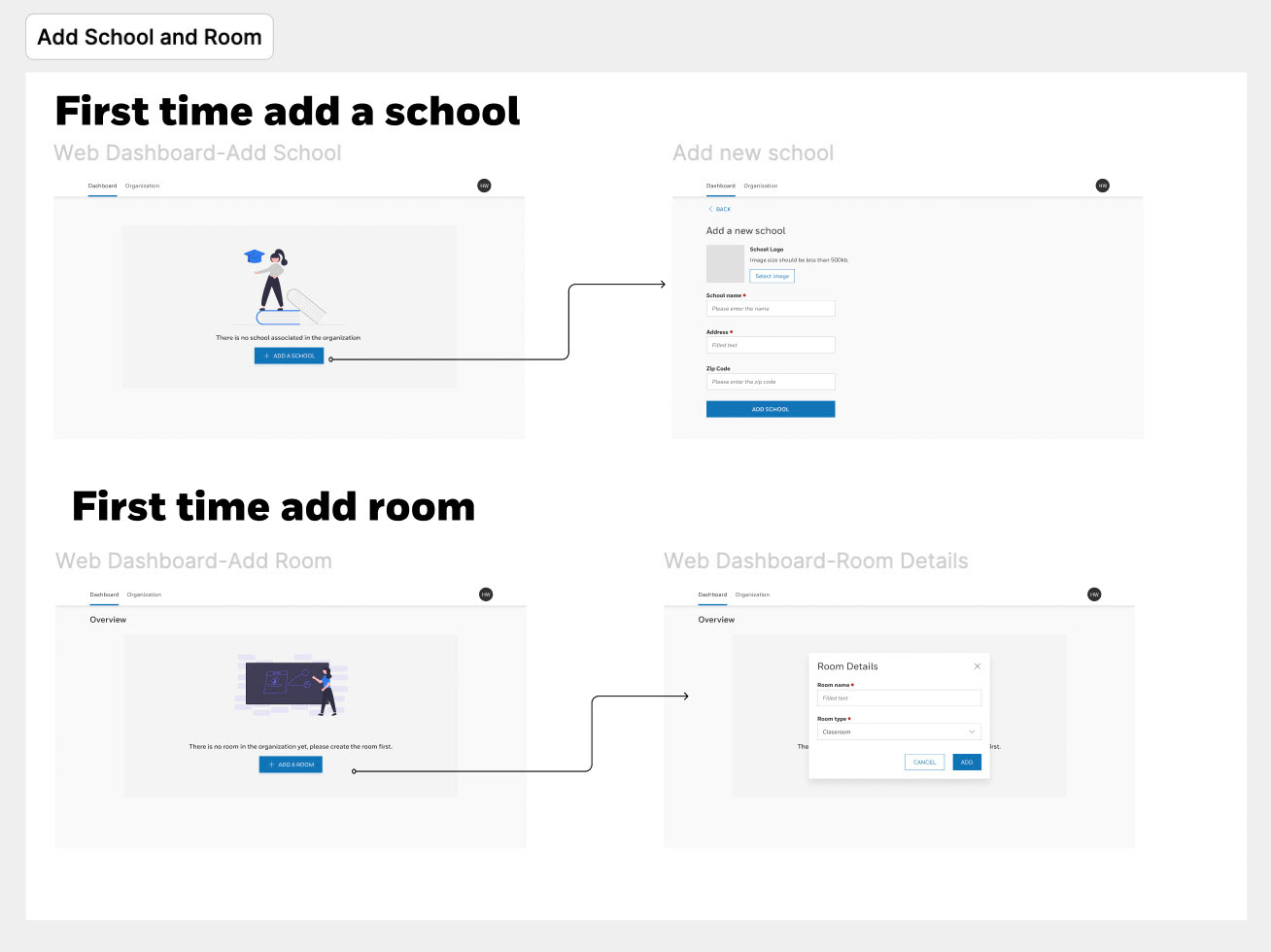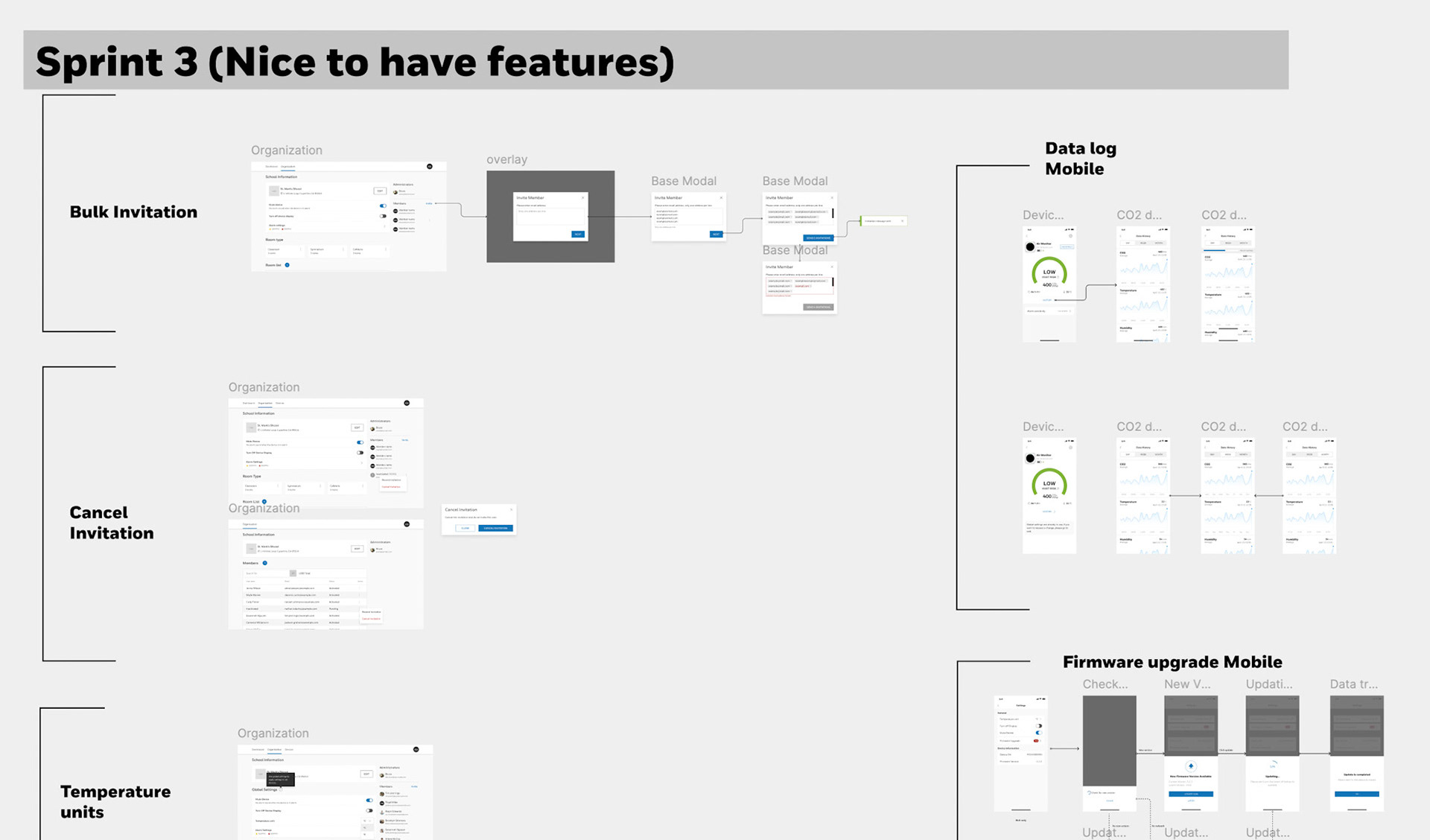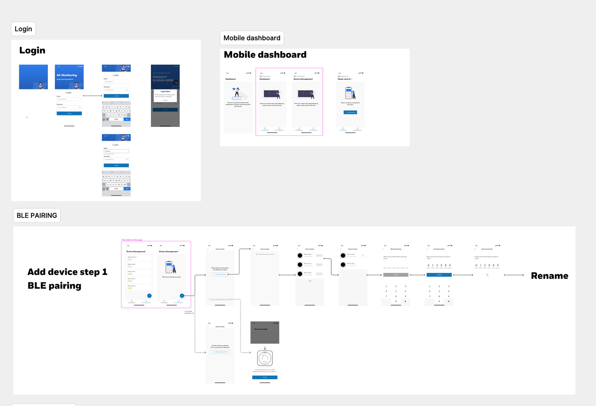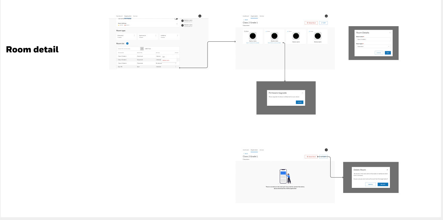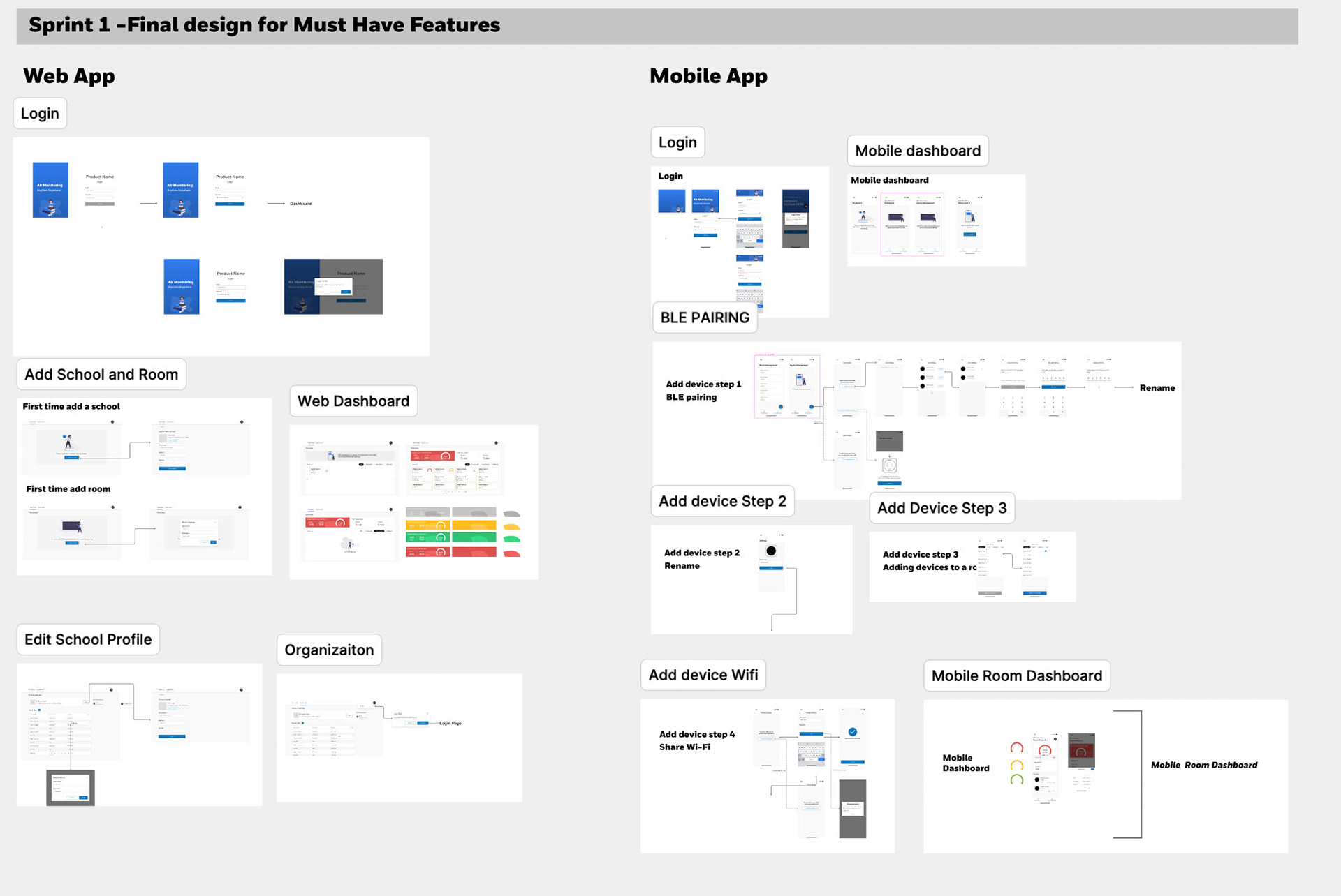 Wireframes & low-fidelity mockups that showeddevice screen UI, mobile app, web dashboard, school and room device screens
