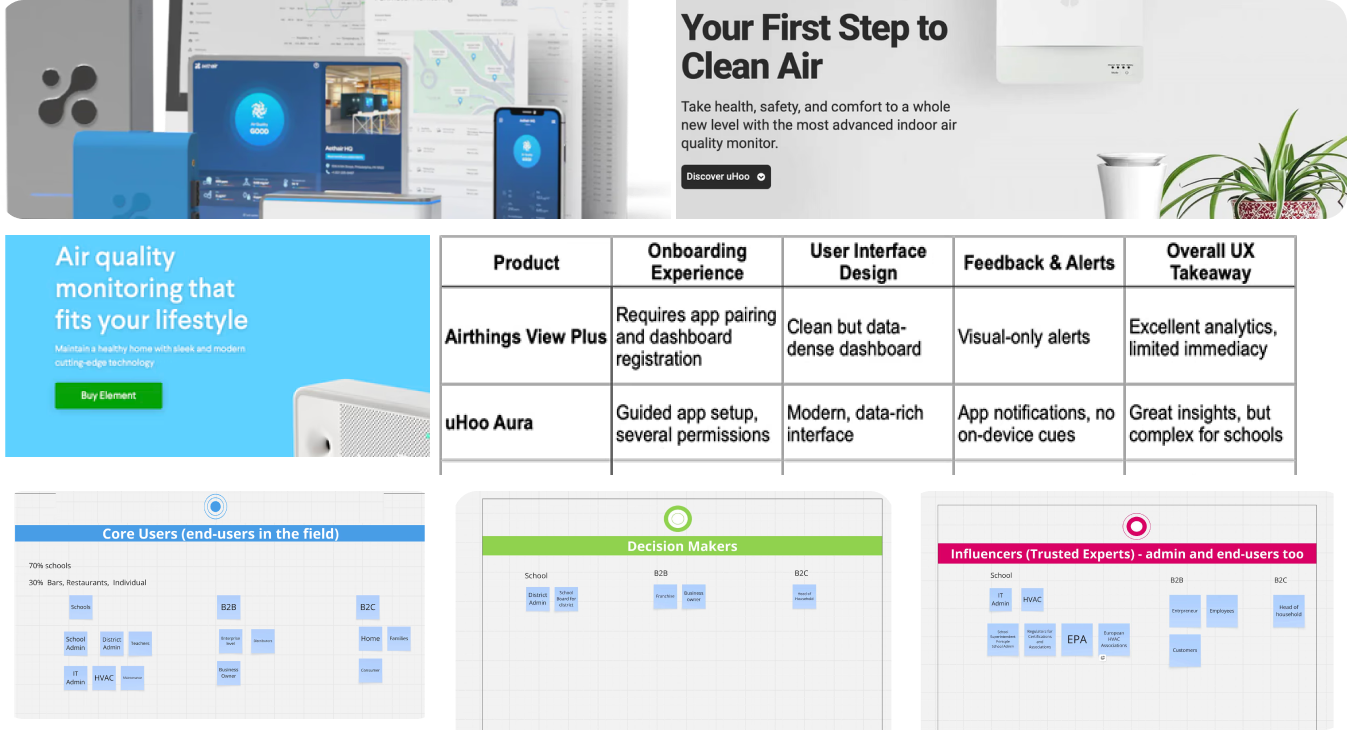 • Competitive / comparative analysis by examining existing air-quality monitors, CO₂-based ventilation tools, and dashboards (e.g. Airthings, IQAir, other IAQ devices) and their UI/UX — to understand how effectively people interpret alerts, color coding, dashboards, data vs. simplicity tradeoffs.