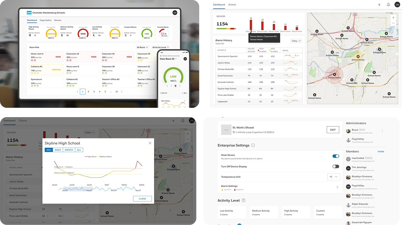 • Dashboard designs for multi-device monitoring (across classrooms, schools, devices) with trend graphs, alarm logs, filtering device types and room types.