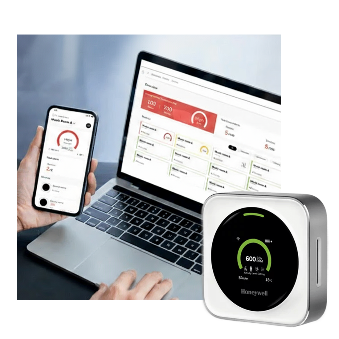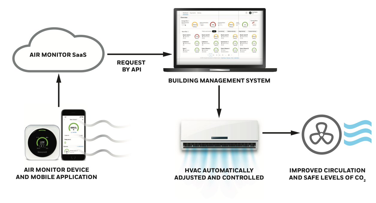 The TRAM measures CO₂, temperature, and humidity, uses three pre-programmed activity-level settings, and gives traffic light visual cues + sound alerts. It's a user-friendly monitor that alerts users when indoor air conditions may present increased risk factors” for airborne virus transmission in schools, restaurants, etc. In a Honeywell “Success Story” document, the product was integrated with the Niagara framework to automate ventilation via BMS control based on alarm thresholds.