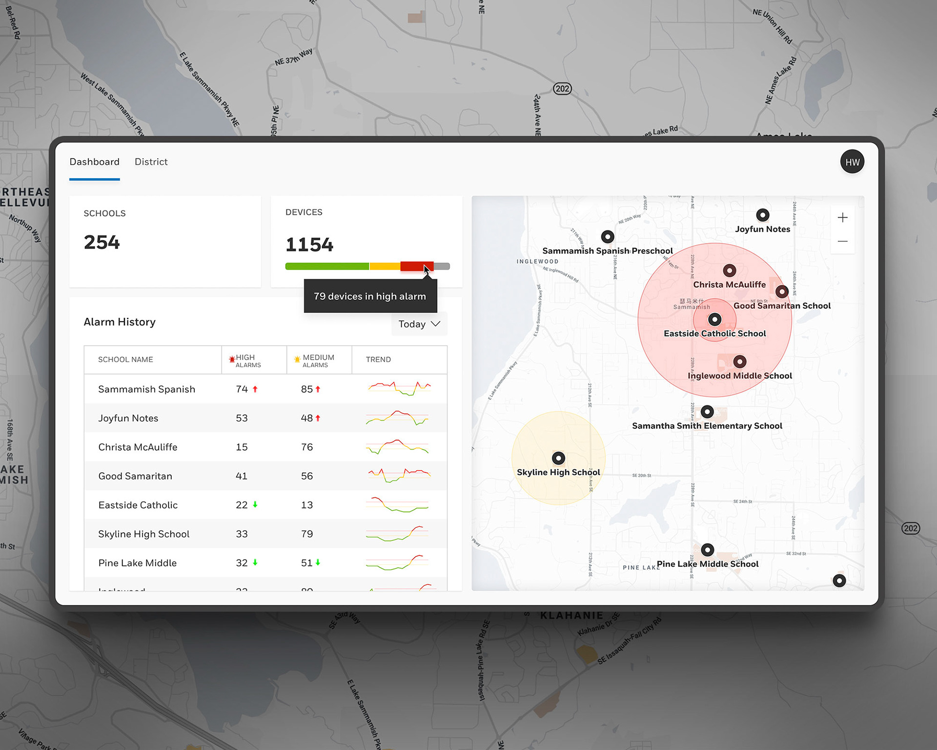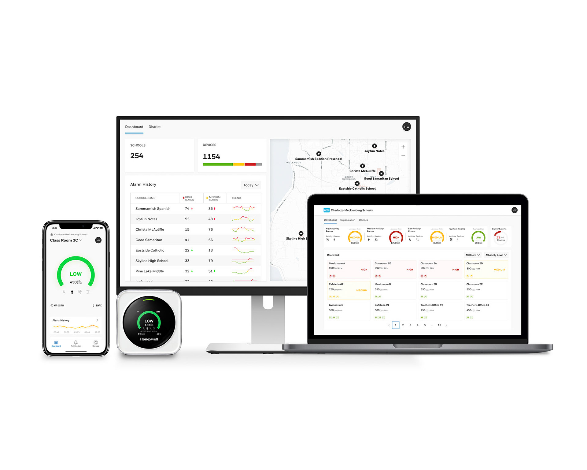 Dashboard designs for multi-device monitoring (across classrooms, schools, devices) with trend graphs, alarm logs, filtering device types and room types.