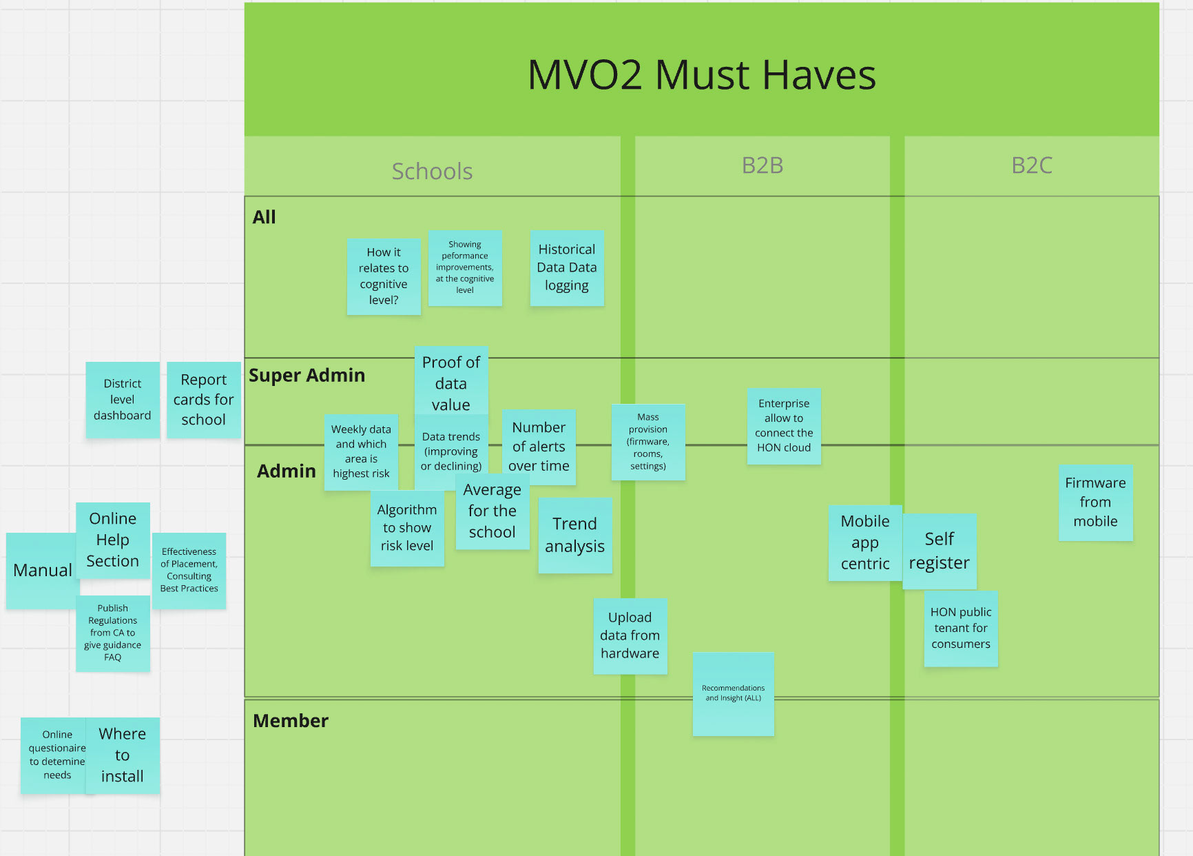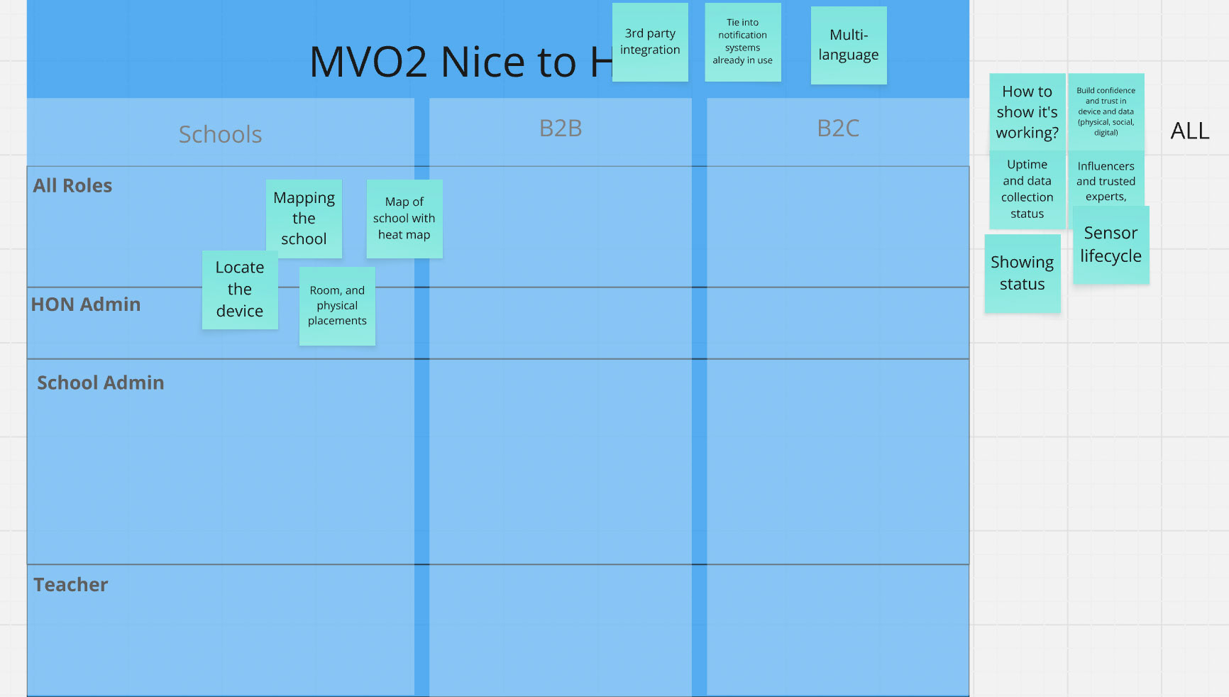 • User & stakeholder interviews with facility managers, teaches, school administrators — to understand their expectations, constraints, and workflows (preferences for visualizing and understanding data, how they would act on alerts with students in the room, setup the device with wifi and bluetooth).