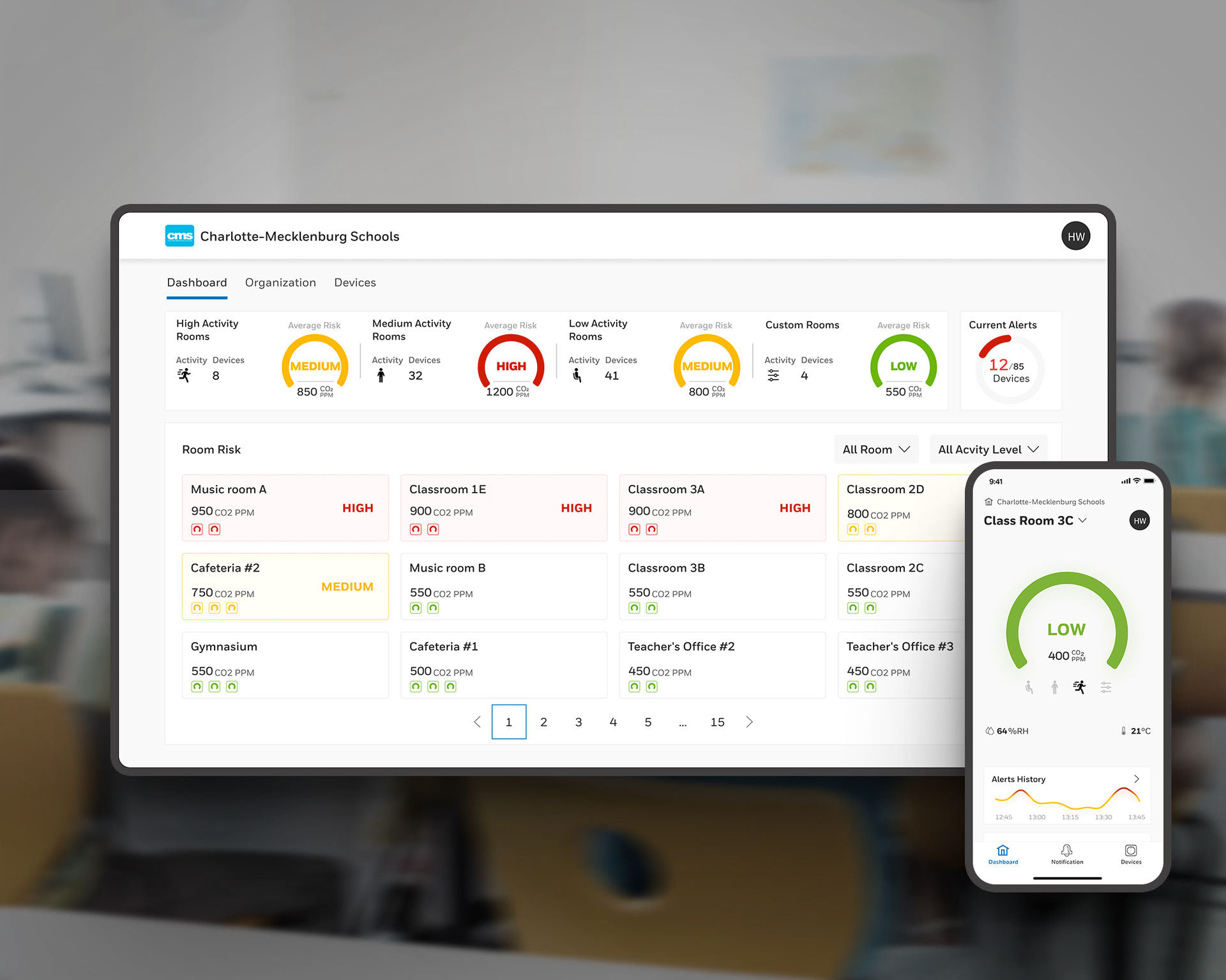 • Air monitoring accuracy for school administrators for a holistic depiction of transmission risk at the school and event district level.