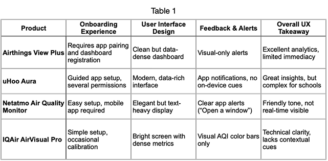 • Competitive / comparative analysis by examining existing air-quality monitors, CO₂-based ventilation tools, and dashboards (e.g. Airthings, IQAir, other IAQ devices) and their UI/UX — to understand how data visualizations are effectivepeople interpret alerts, color coding, dashboards, data vs. simplicity tradeoffs.