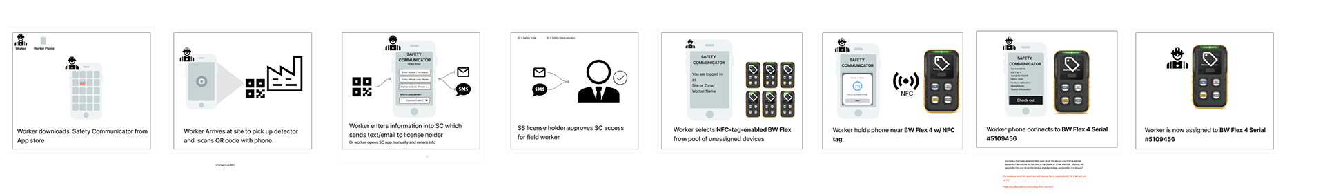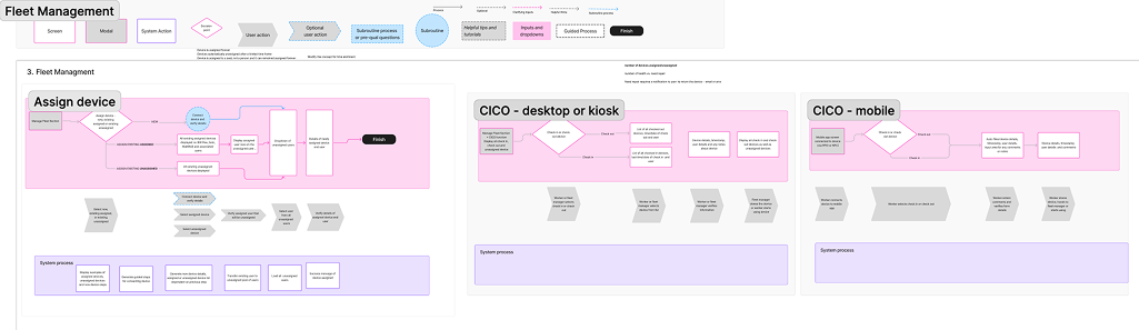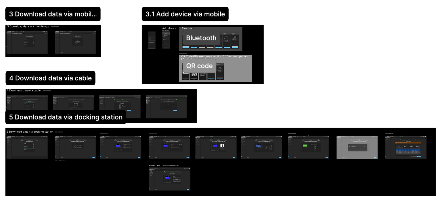 This analysis revealed deeply nested flows and redundant paths — many users had to switch between desktop apps, mobile apps (Safety Communicator, Device Configurator), and docking stations just to perform simple tasks like firmware updates or alarm calibration.