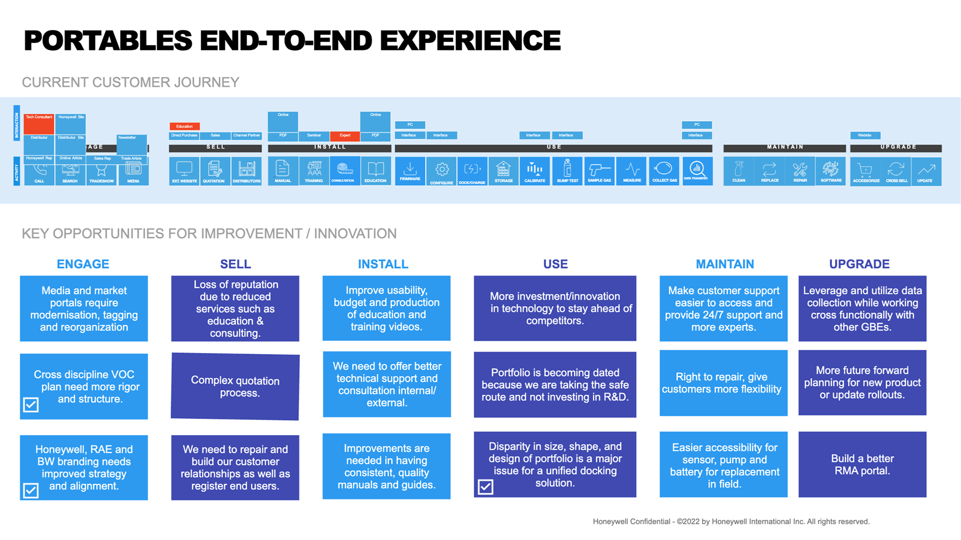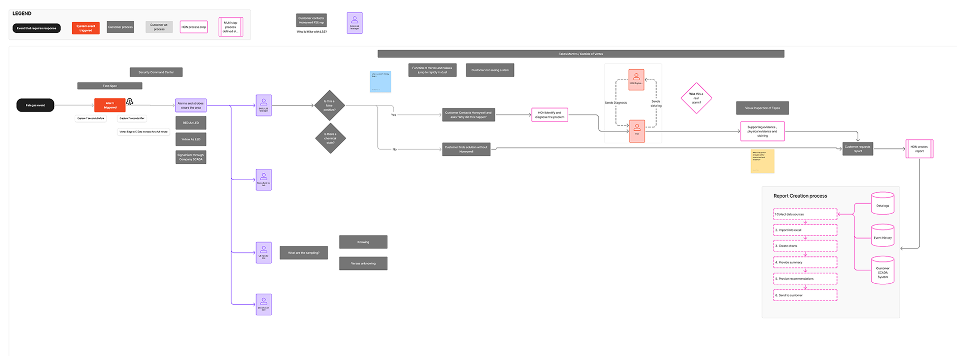 Over four collaborative workshop sessions, a cross-functional team—including field service engineers, tech support leads, software developers, mechanical and electrical engineers, systems engineers, offering managers, and global fellows—examined the end-to-end customer experience of Honeywell’s gas detection systems.