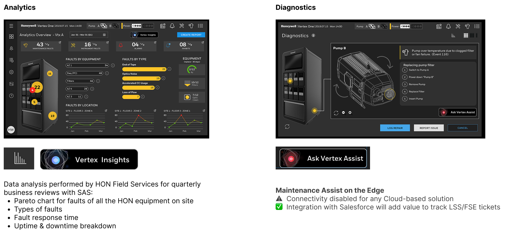 We also heard that field service technicians wanted more insights into faults and alarms on the Vertex. So we provided easy to digest visulizations that also helped with the quarterly reporting process for customers. The resulting savings could amount to $1M+ annually and increase revenue for Honeywell in the high tech space.