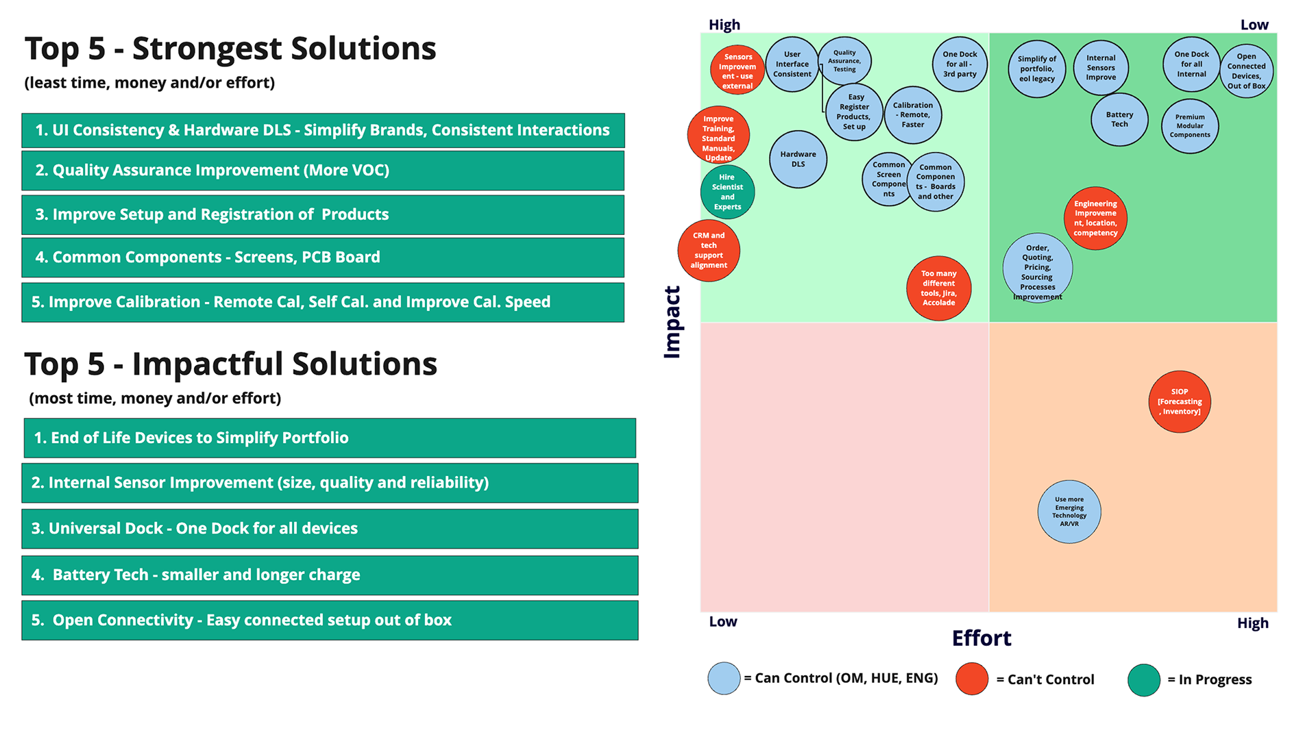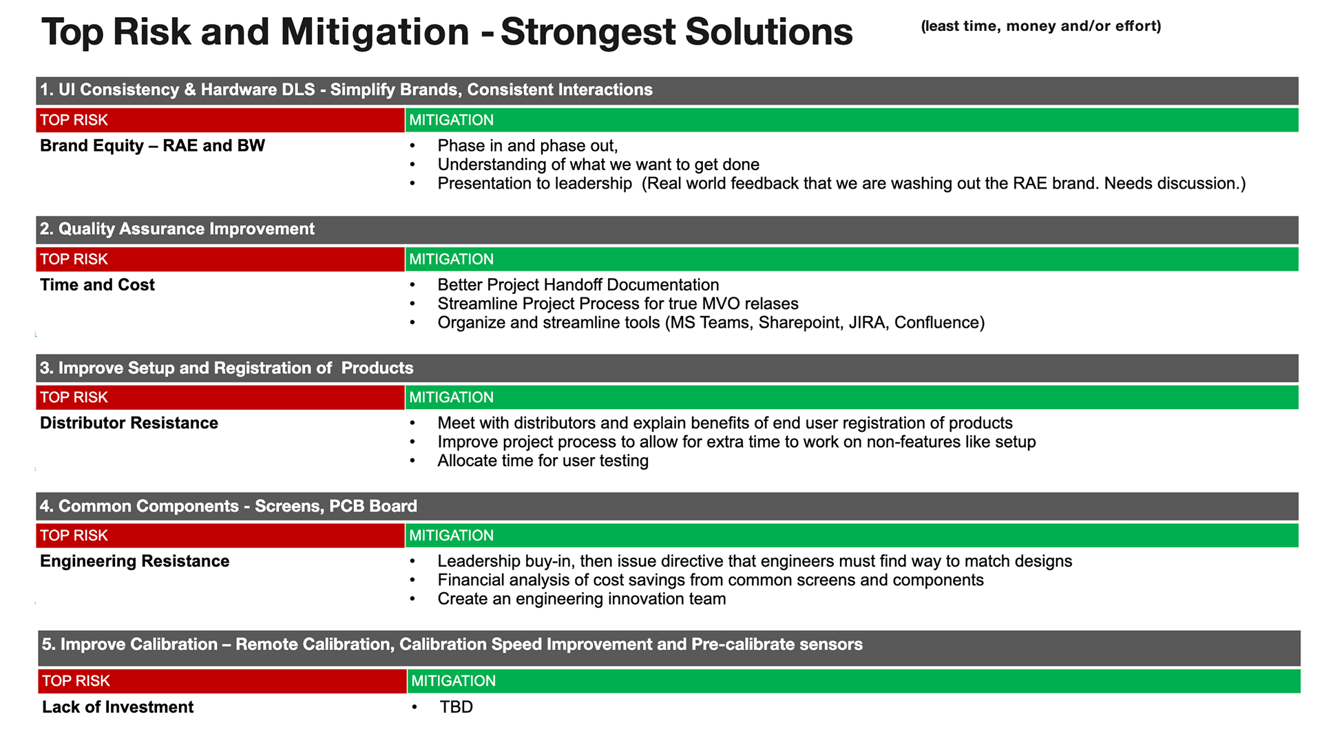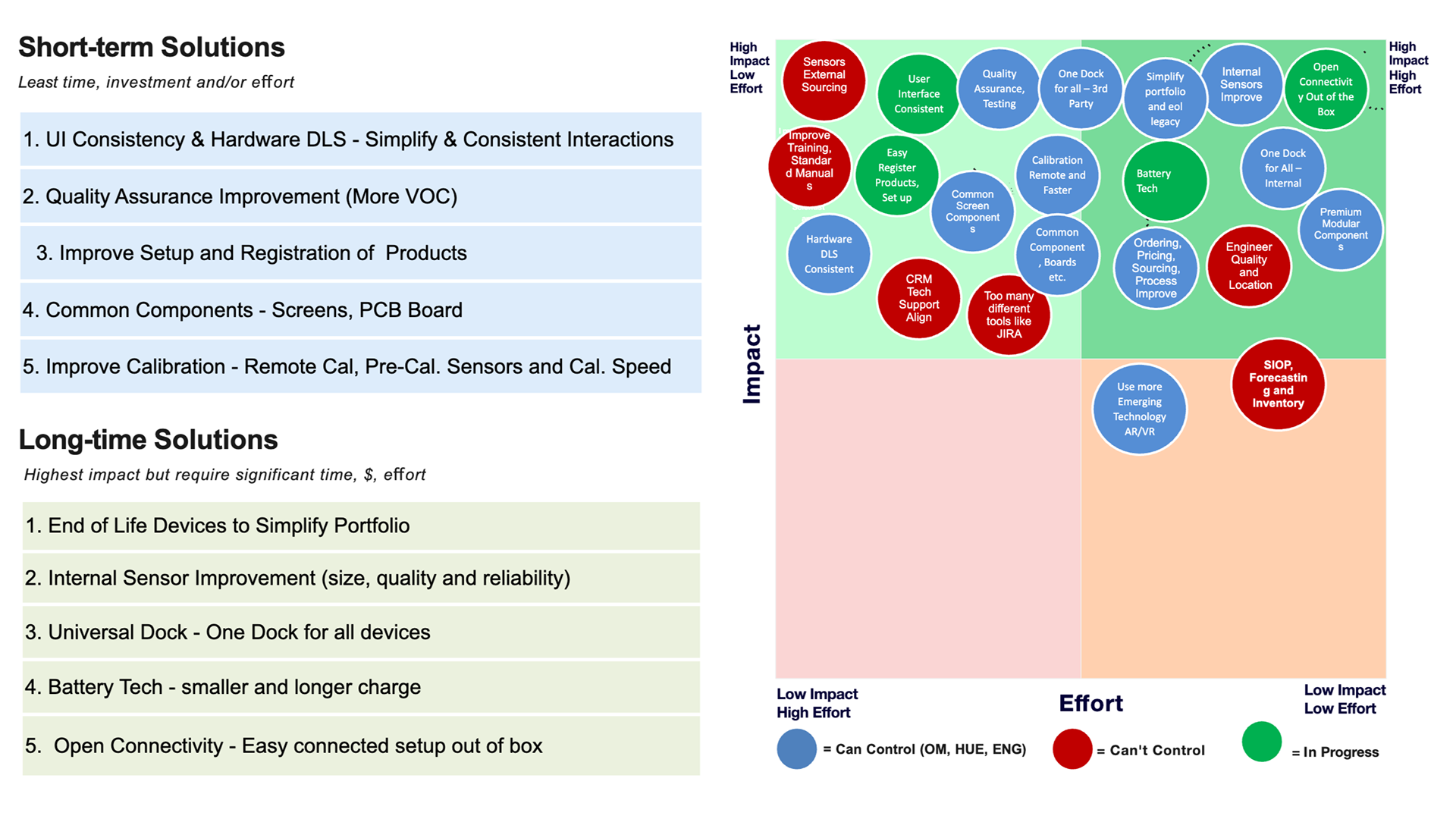 (Example from a similar project of prioritizing, analyzing keyword mentions, E2E experience, short-term/long-term solutions with impact/effort matrix, strongest/impactful solutions, top risks and mitigations)