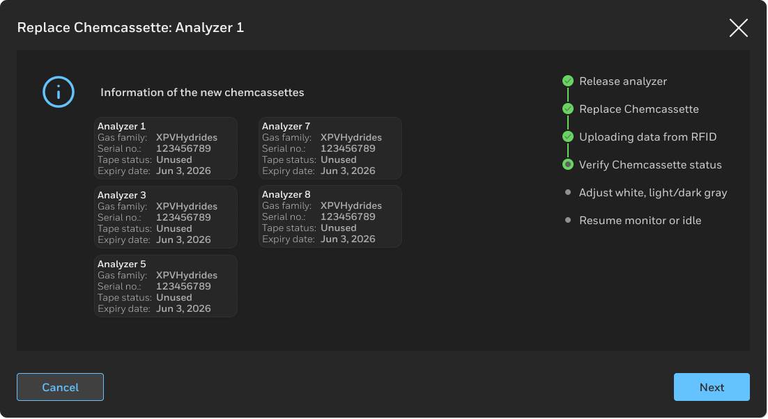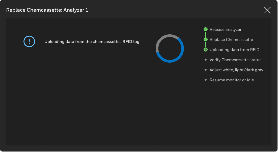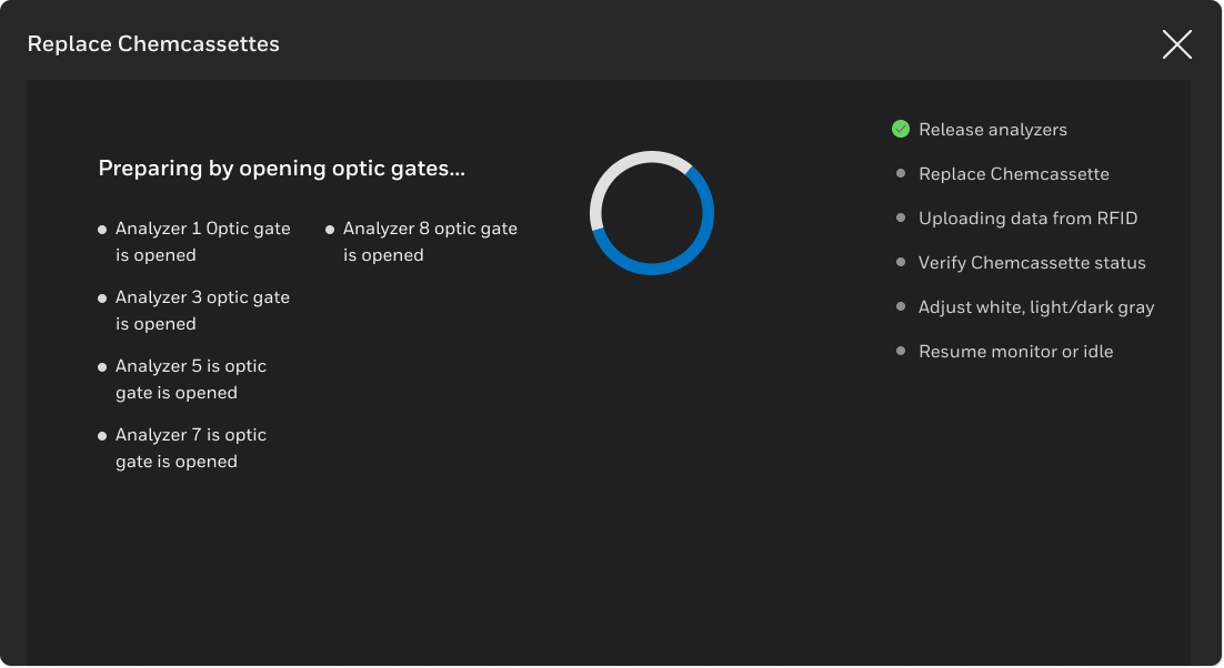 We heard repetitively that documentation was lacking and that training was needed. We solved this by explicity detailing the steps of complex tasks like replacing Chemcassettes while providing instant and descriptive feedback for any errors. The user can go forward, skip or go back on any step so there is the ability to recover from errors.