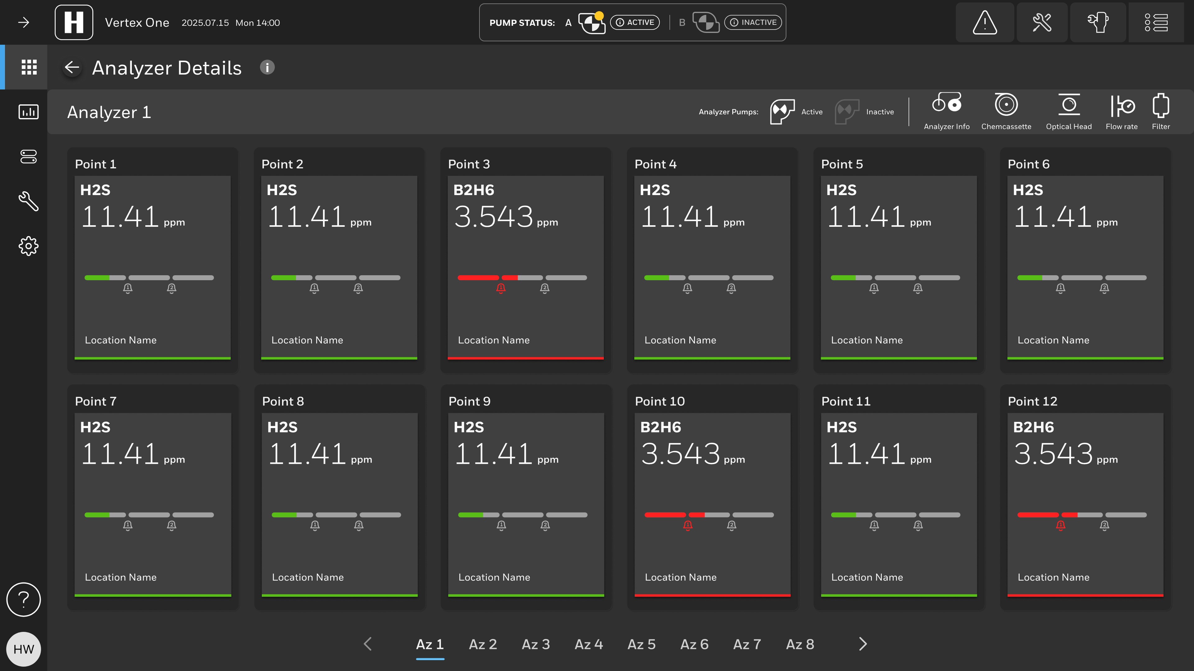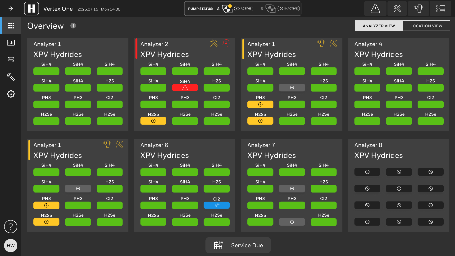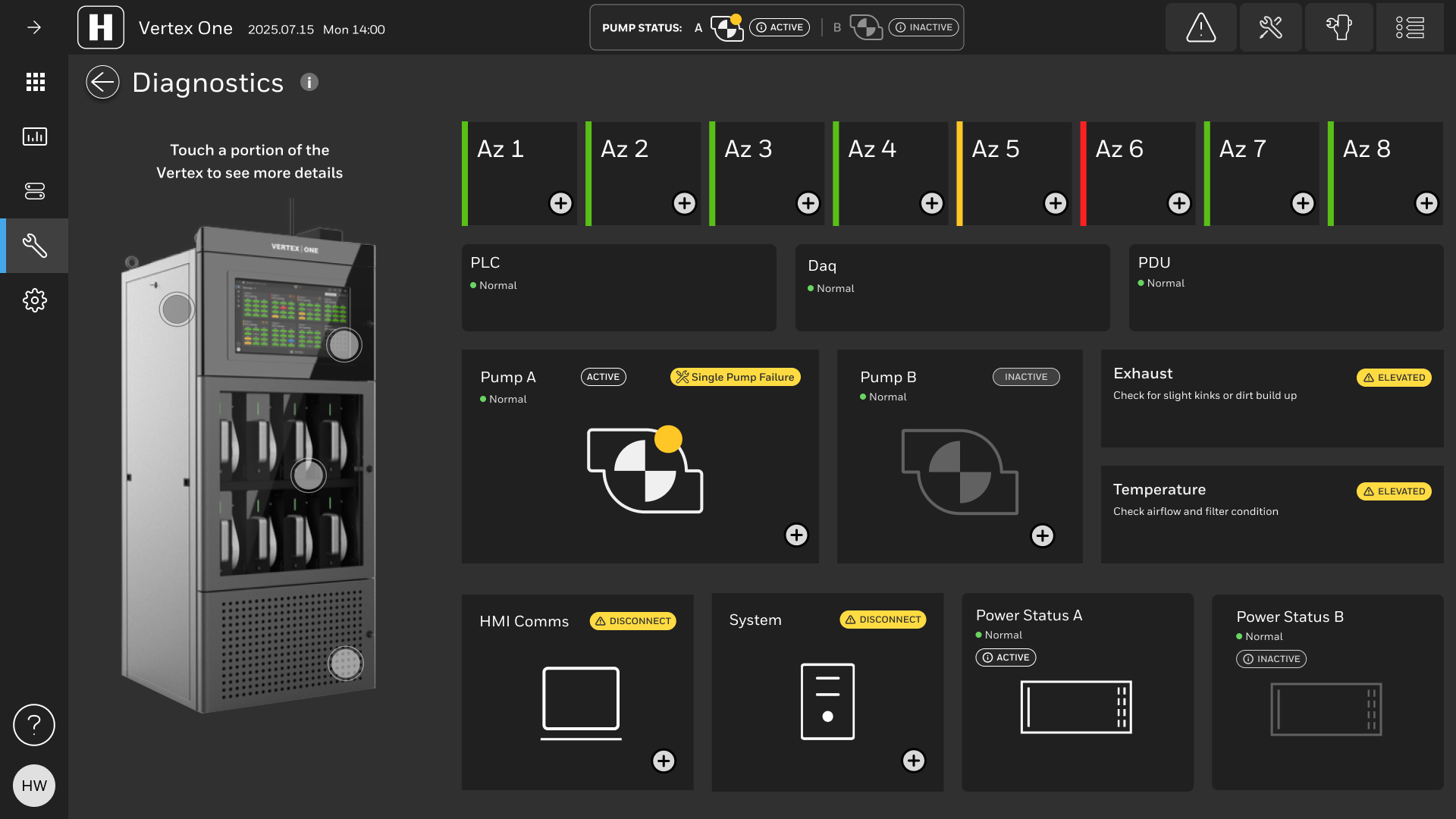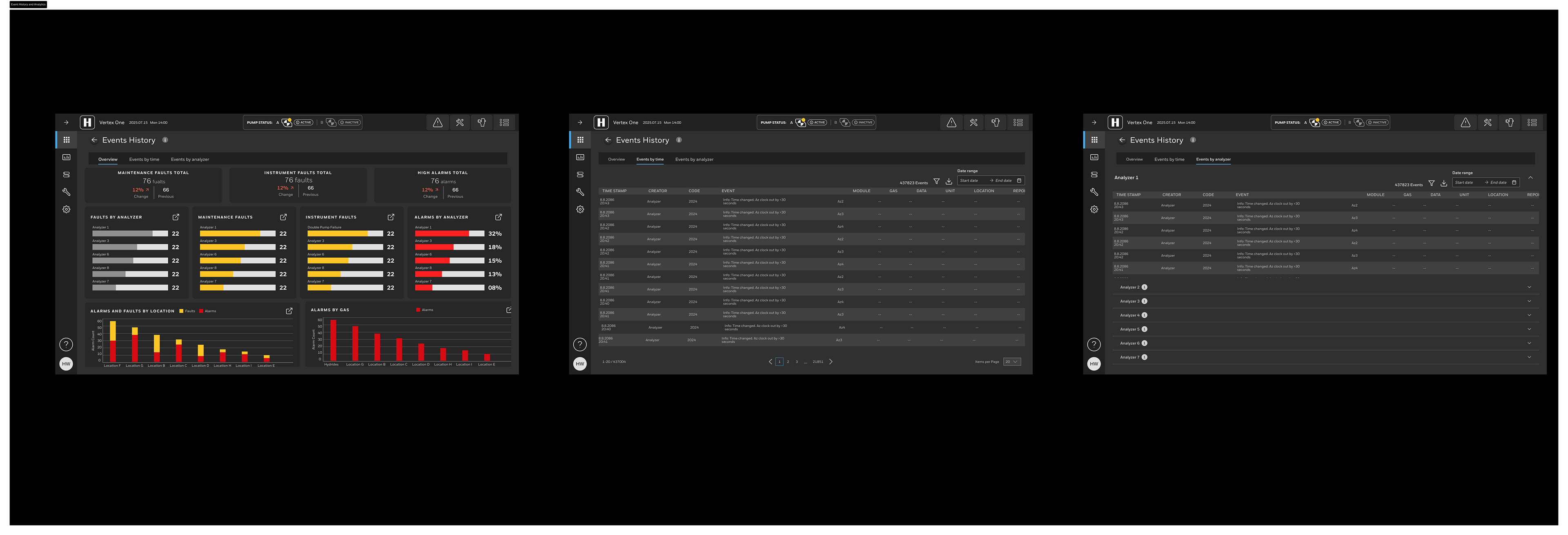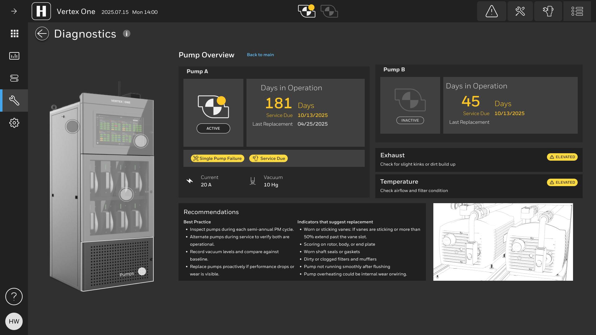 The new scan line mirrors the exterior indication of alarms and alerts. The icons within alarm and faults on each point is a special consideration for low vision and color blind users as red and green is a common challenge for color blind users. We made the pump status more easy to digest and more descriptive of faults since this is one of the differentiators the new Vertex. Location grouping was a submitted invention disclosure for this project as was another feature for disabling the automatic pump swap.