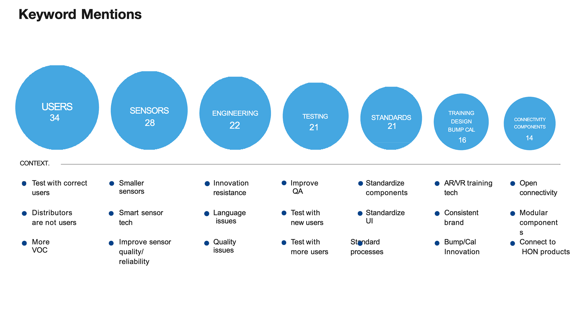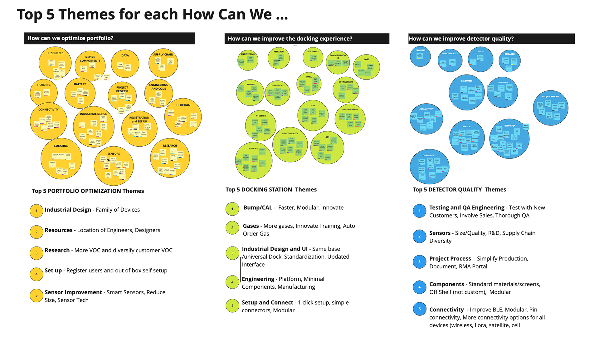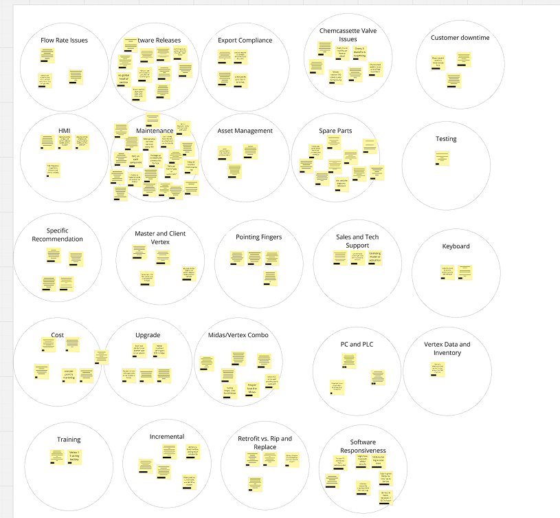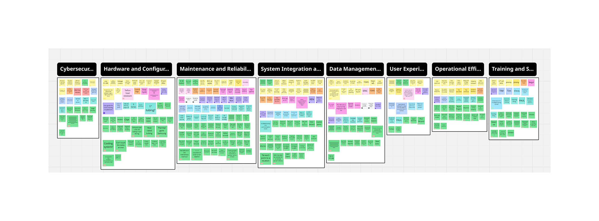 With the workshop complete and key themes identified from pre-work with technical support tickets, stakeholder interviews, and the How Might We session, we now have clear priorities and initial solution paths to pursue. Themes such as documentation, configuration, custom recommendations, preventative maintenance, and PLC issues have emerged as core areas of focus. Next, we’ll examine the note clusters around these themes to determine where to concentrate our efforts.