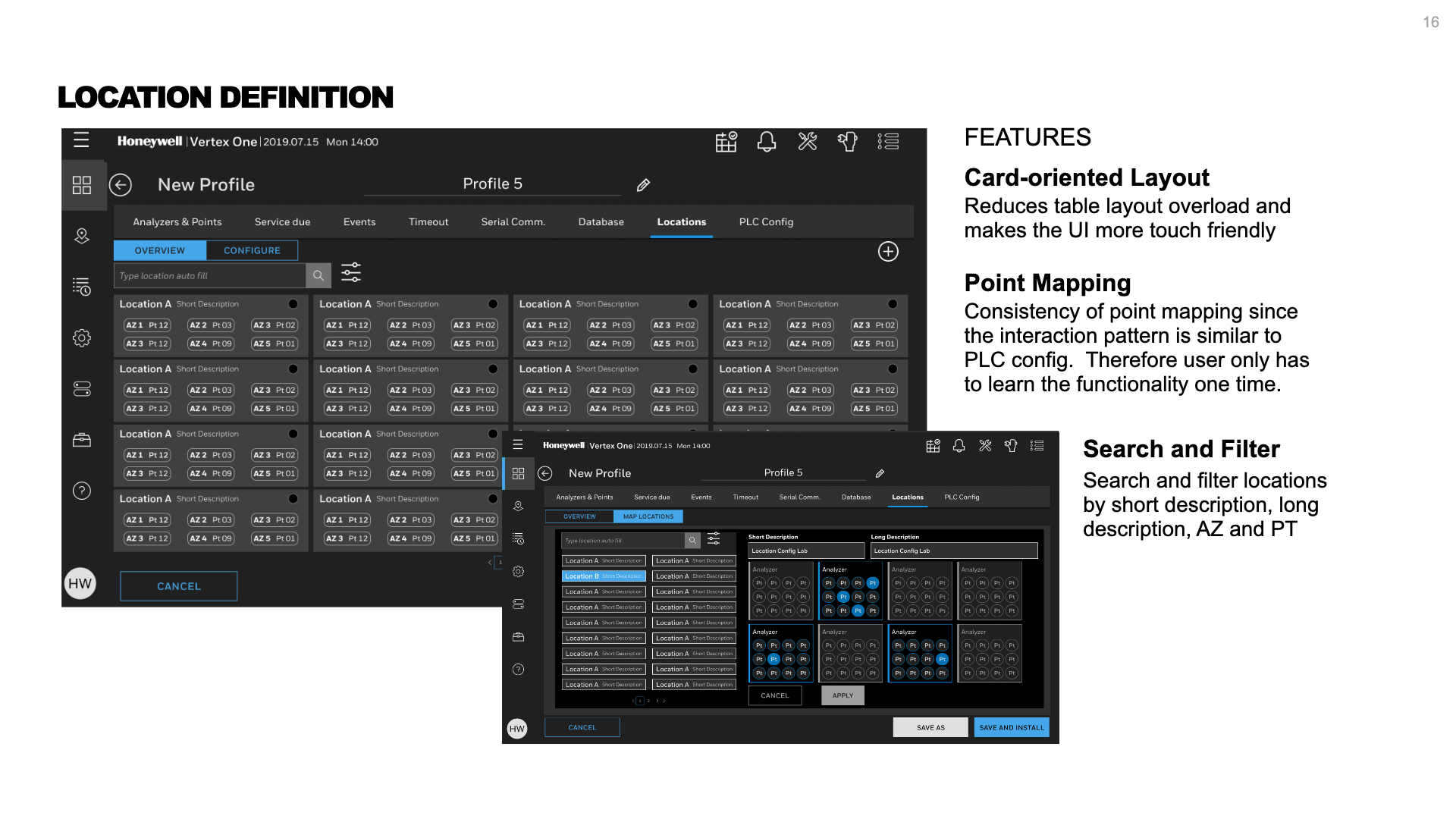 • Design Governance: The specialized design system for the Vertex touchscreen interface utilized reusable components and placeholders. This allowed the design team to establish consistency with Honeywell's larger enterprise design standards as well as accomodate flexible and scalable upgrades.