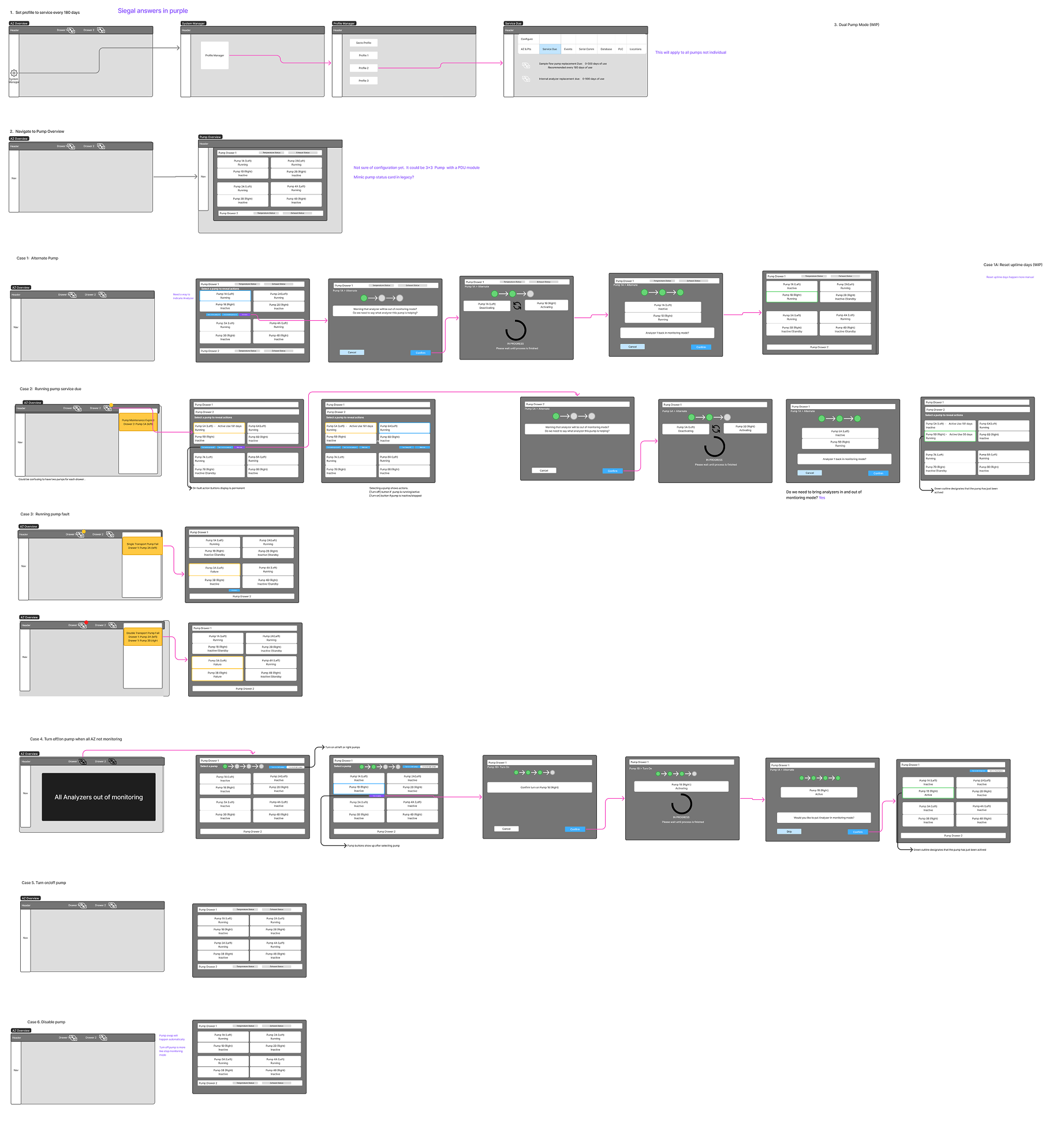 Mapping out flows with field service helped the team to better understand the steps involved when serious issues surrounding gas detection disrupted the FAB. Another key workflow introduced a differentiating feature for disabling auto pump swap and helped stakeholders visualize the functionality.