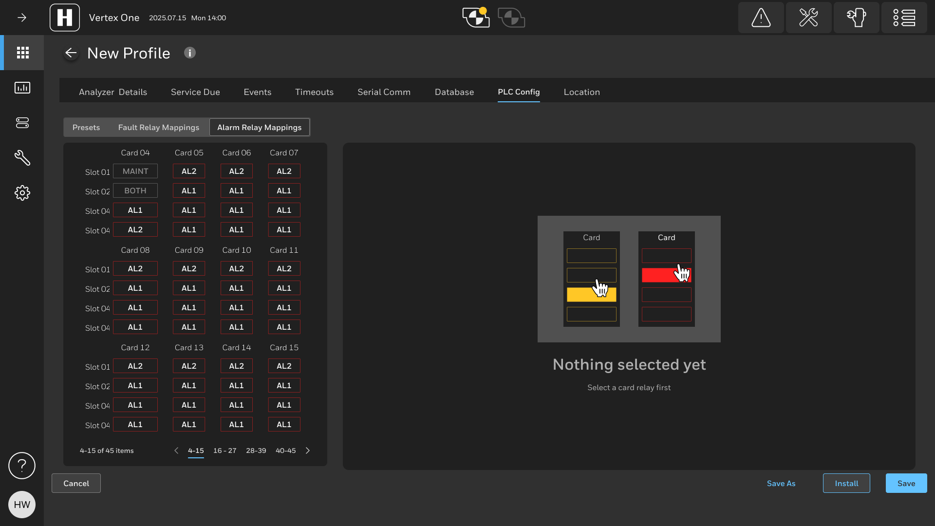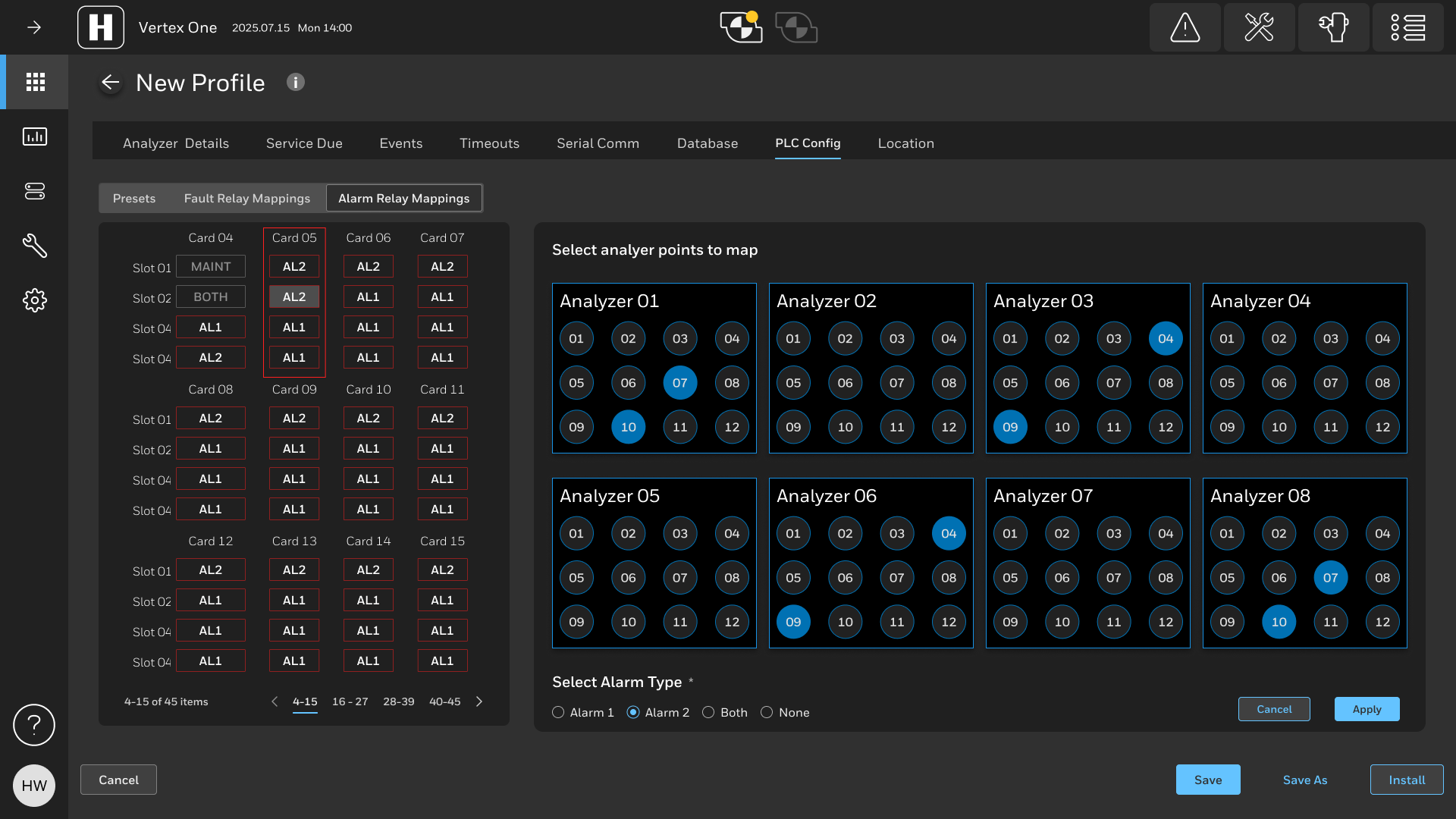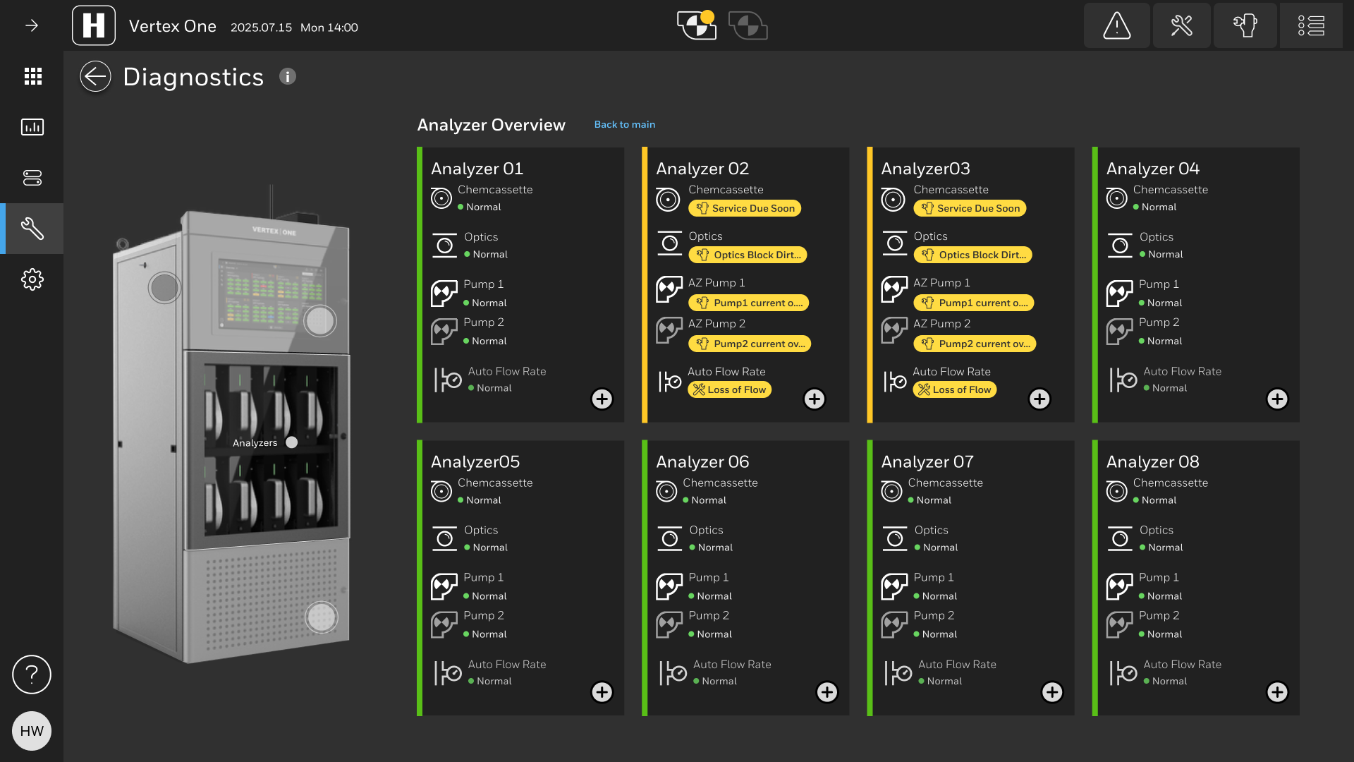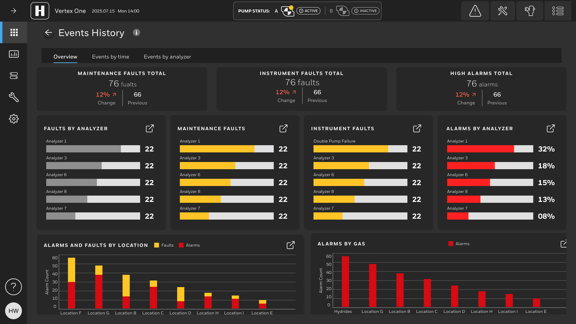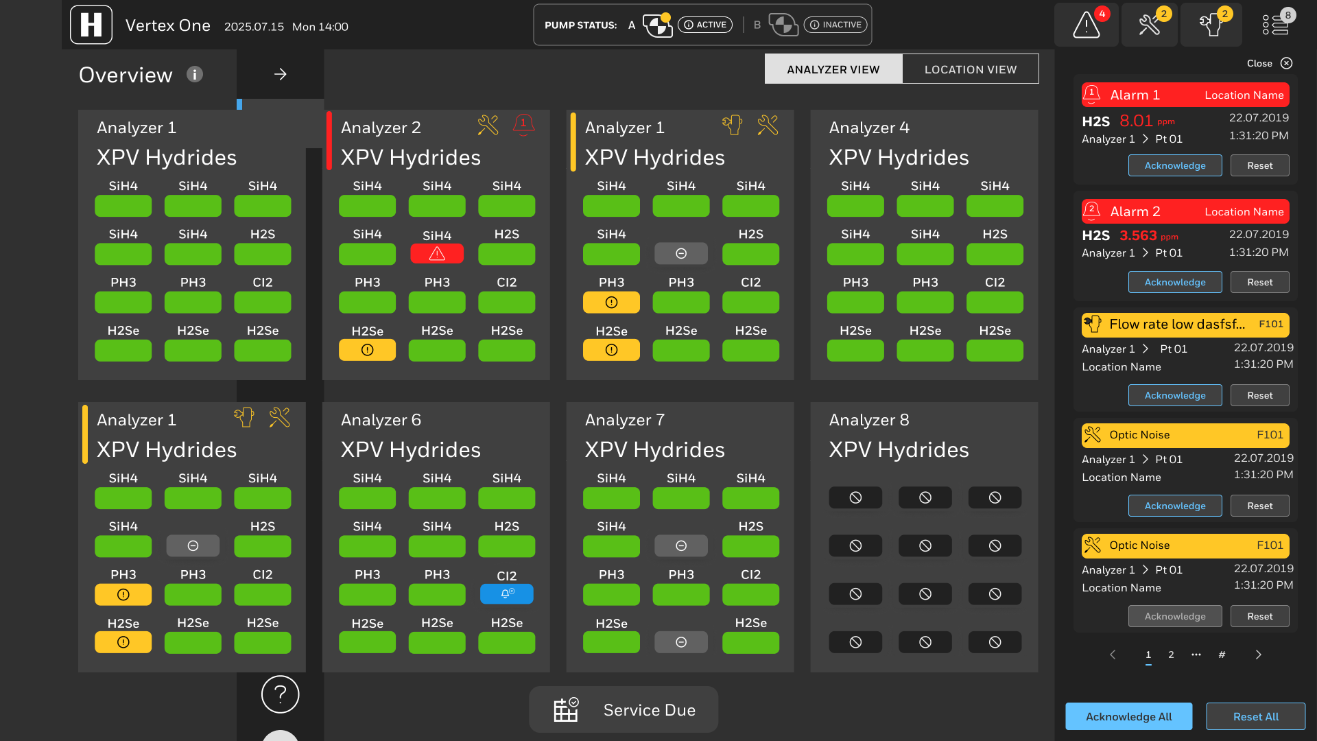 Analyzer overview screen display point alarm and faults with special consideration for low vision and color blind users as red and green is a common challenge for color blind users. Alarms and fault notifications are automatically revealed in real time via a side panel with prominent, high-contrast indicators. The pump status in the header is easier to digest and more descriptive of faults since this is one of the differentiators the new Vertex.