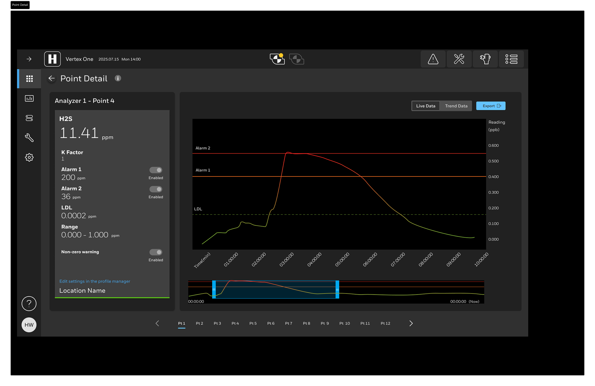 Analyzer details show an overview of points with graphical representation of current concentration levels so field technicians can view when a point may be approaching the danger zone.