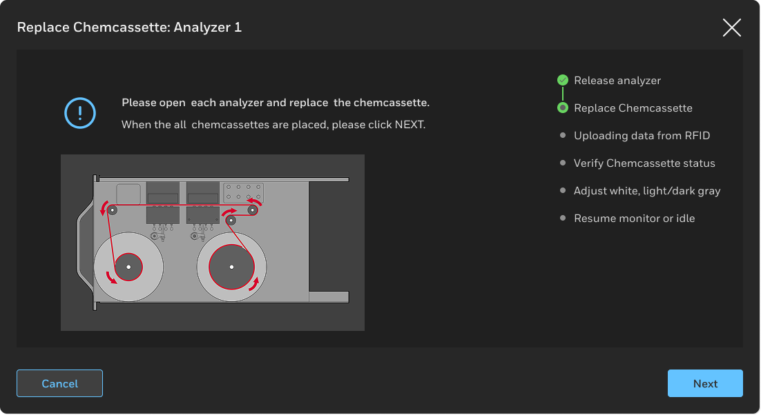 We heard repetitively that documentation was lacking and that training was needed. We solved this by explicitly detailing the steps of complex tasks like replacing Chemcassettes while providing instant and descriptive feedback for any errors. The user can go forward, skip or go back on any step so there is the ability to recover from errors.
