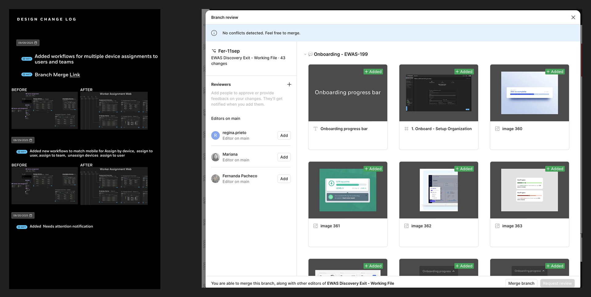 During the dev handoff process it's critical to keep designs updated when there will inevitably be minor tweaks. This is why I implemented a versioning system that included branch and merge functionality similar to GitHub. This native-Figma functionality allowed designers and developers to stay in sync and schedule updates after release in subsequent sprints. Annotating designs is another critical and often overlooked part of the design process. Annotations reduce the amount of back and forth between developers and stakeholders alike.